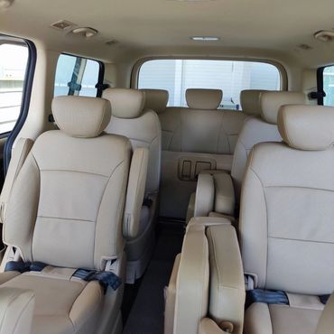 Up to 7 passengers at a time. Well appointed, clean and hygienic with amenities like water and tissues. Baby seat on request.